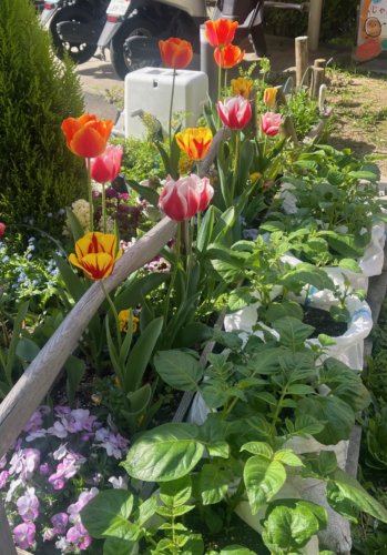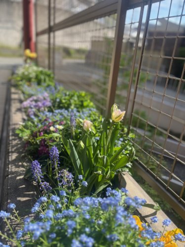 一昨年は、勿忘草やパンジーのこぼれ種が芽吹き、一面にお花畑が広がりました。今年も、昨年の秋に植えたチューリップが色とりどりに咲き揃い、訪れる方の目を楽しませてくれています。