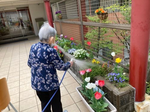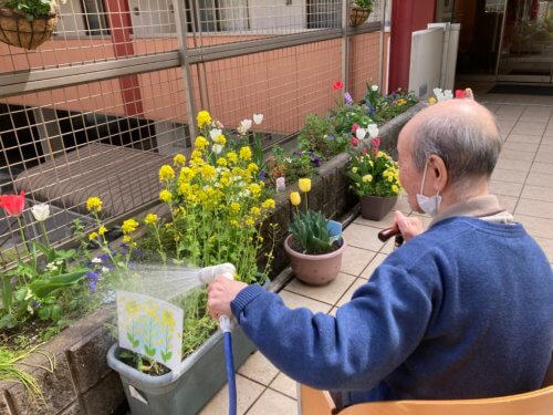 暖かい日には、小規模多機能ホーム「楽(このむ)」のご利用者さまも一緒に水やりをしてくださり、春の庭がますますにぎやかになっています。