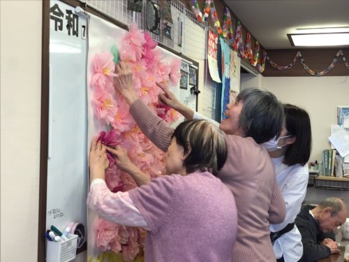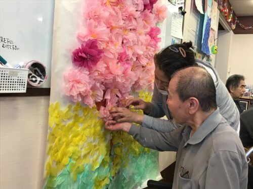 毎月第4火曜日は、皆さまお楽しみのオレンジカフェイベント「工作レクリエーション」の日です。今月は、満開の菜の花と桜の壁面飾りを制作しました🌸