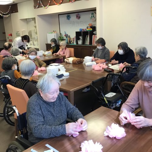 ピンクのお花紙を折ったり、切ったり、貼ったり……。 手先を使った作業は自然と生活リハビリにもつながります。