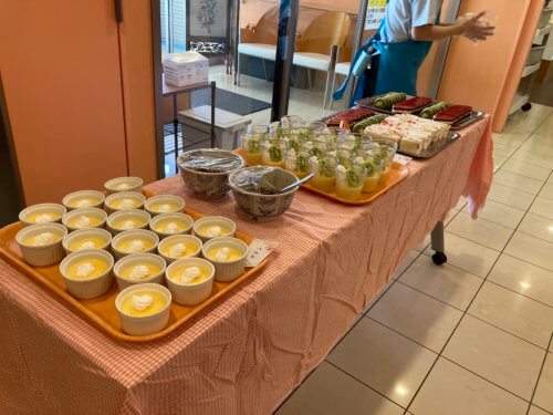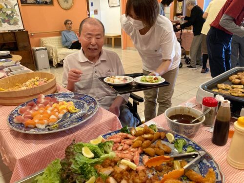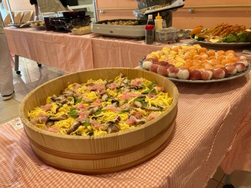 定番のちらし寿司に手まり寿司、エビフライ、彩りサラダ、たこ焼き、お蕎麦、焼き魚、そしてデザートには数種類のケーキや手作りプリンまで…。今日ばかりは「お好きなものをお好きなだけ召し上がっていただきたい」と、厨房の調理師たちが心を込めて腕をふるいました!
